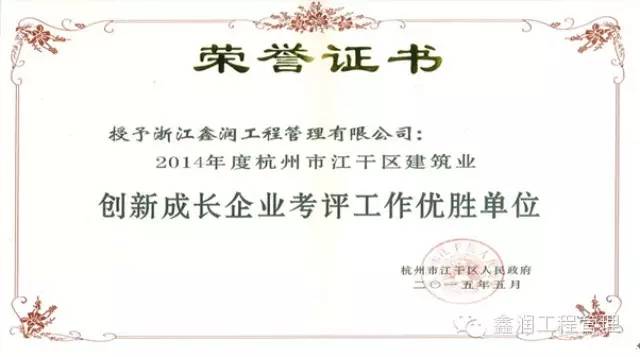 2014年,在區委、區政府的正確領導下,我公司緊緊圍繞江干區全力打造“國內一流現代化中心區”的發展總目標,積極適應經濟新常態,以規范建筑市場行為、確保工程質量安全、提高經濟效益為著力點,在拉動經濟發展、擴大勞動就業等方面取得了較好的成績,經行業主管部門考核評選,并報區政府同意,我公司獲得2014年度杭州市江干區建筑業創新成長企業考評工作優勝單位。愿鑫潤為江干區全力打造為“國內一流現代化中心區”做出更大貢獻!